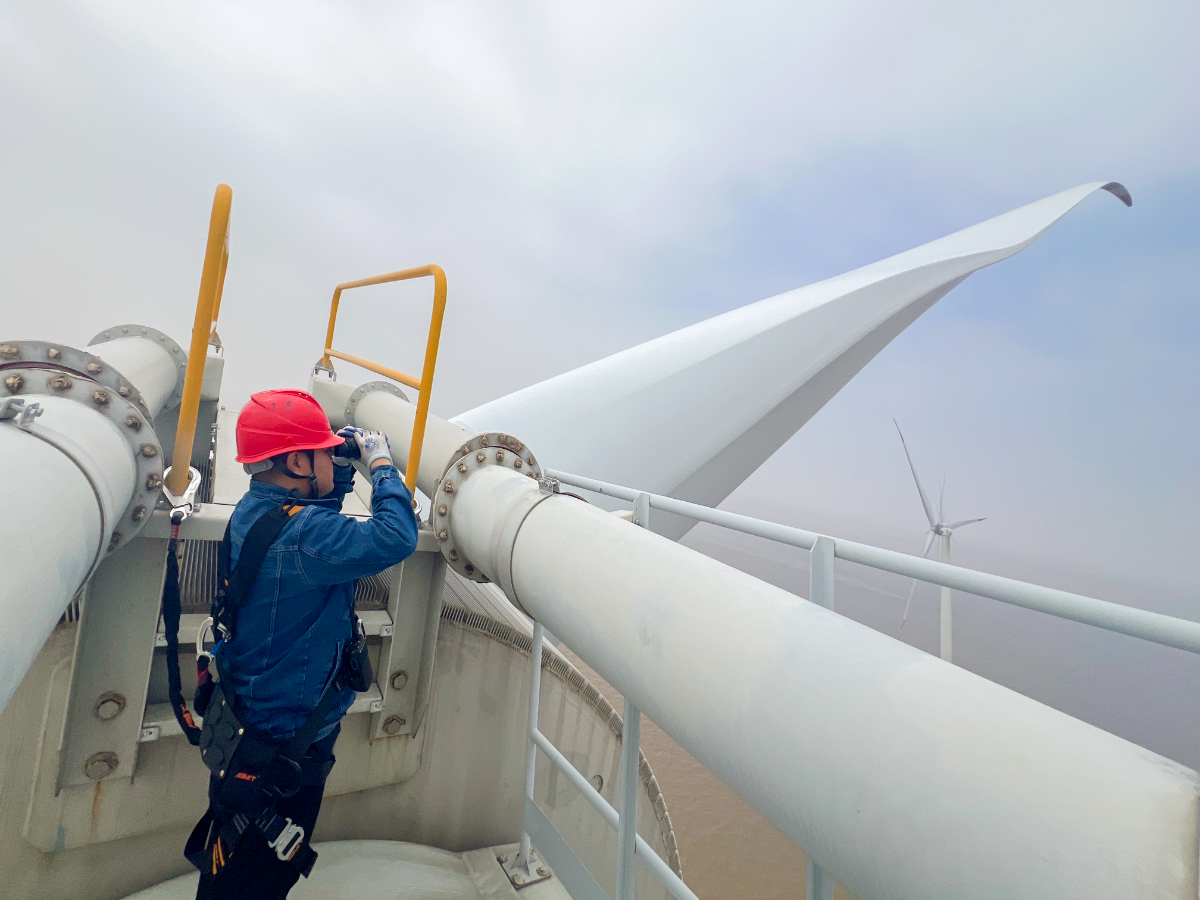 浙能海上風電維護人員對風機葉片進行定期檢查。 張露 提供