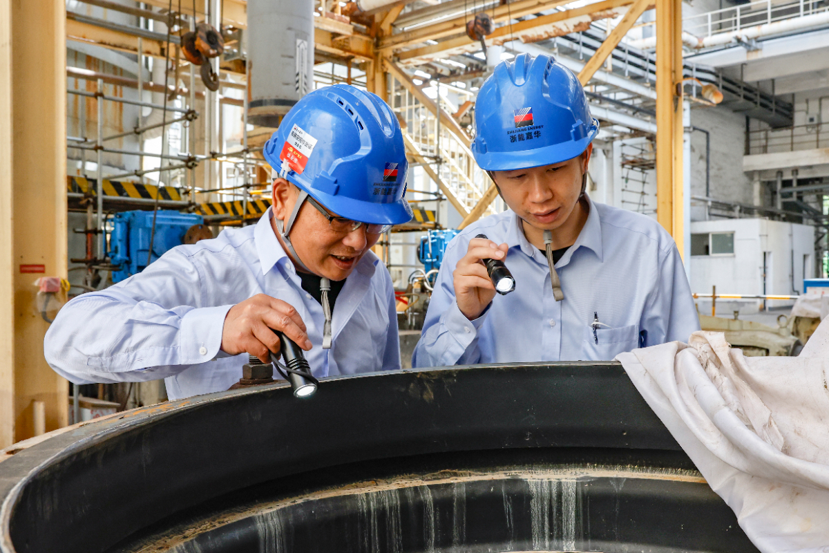 嘉電維護(hù)部鍋爐四班班長徐永忠與鍋爐專業(yè)組長沈忠明檢查零部件。 王侃 攝
