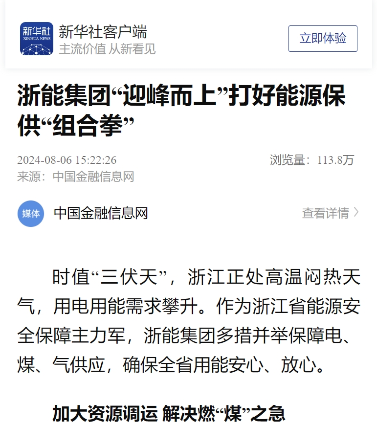 新華社客戶端、新華財(cái)經(jīng)客戶端報(bào)道《打好迎峰度夏“組合拳” 浙能集團(tuán)持續(xù)提升能源保供能力》。