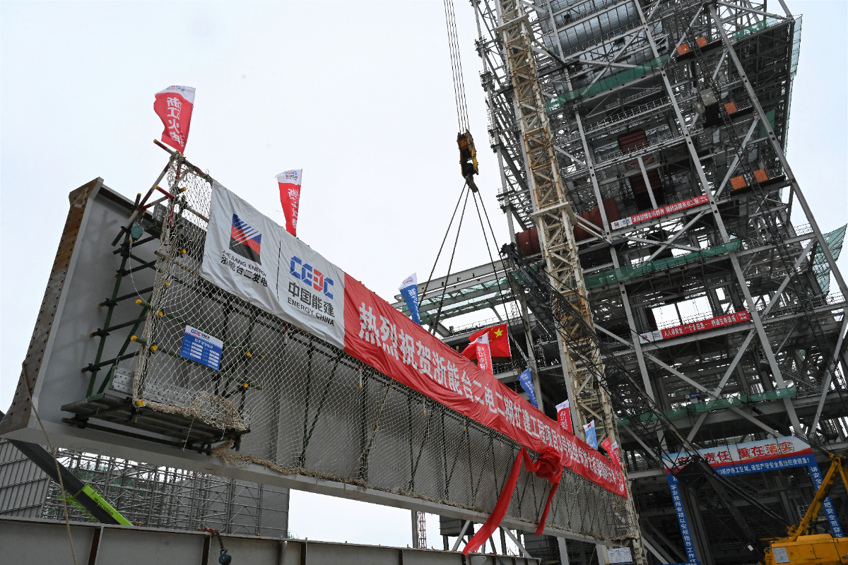 臺二電二期3號鍋爐首根大板梁吊裝就位。 俞琬 提供
