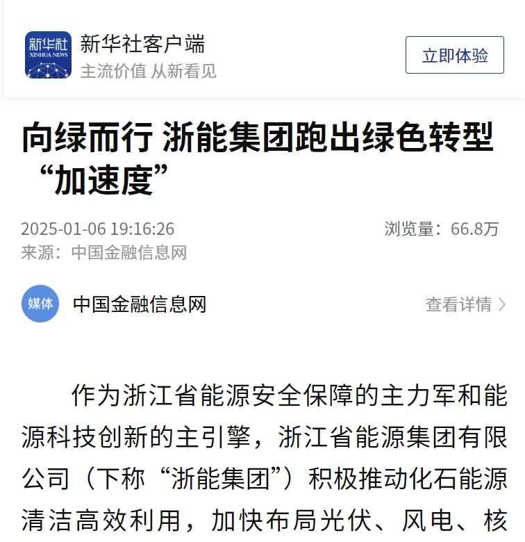 近日,新華社推出浙能集團高質量發展主題系列報道,并于1月6日刊發《向綠而行 浙能集團跑出綠色轉型“加速度”》。