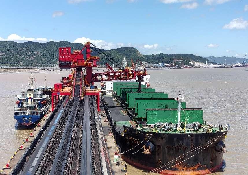 浙能集團采購的進口煤正在舟山六橫港搶裝,為省內電廠送去“口糧”。 劉洋 攝