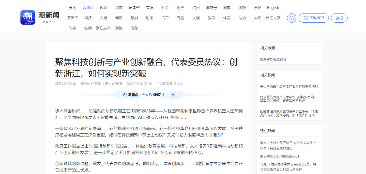 潮新聞報道《聚焦科技創(chuàng)新與產(chǎn)業(yè)創(chuàng)新融合,代表委員熱議——創(chuàng)新浙江,如何實現(xiàn)新突破》。 潮新聞客戶端 圖