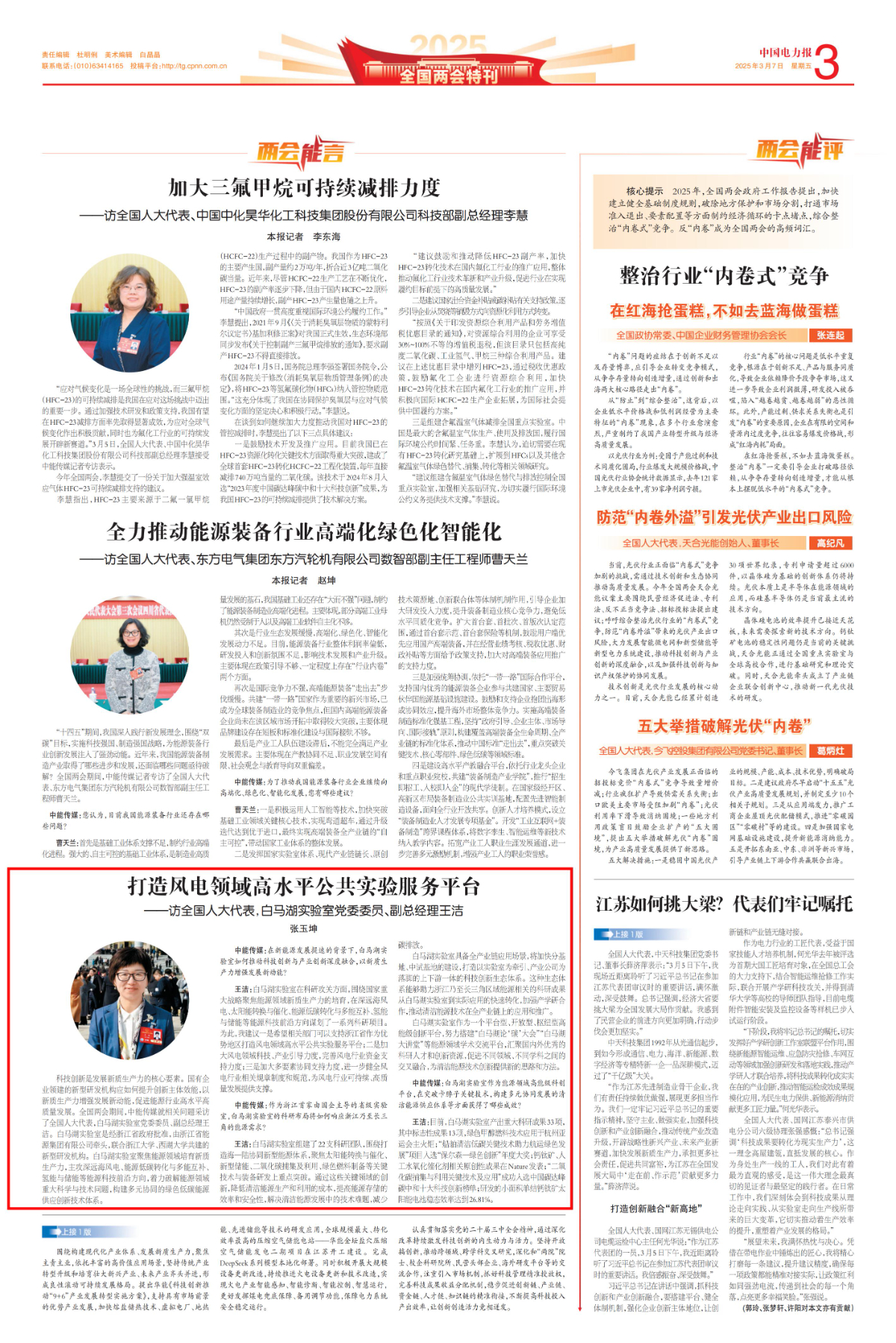 《中國電力報》報道《全國人大代表王潔:打造風(fēng)電領(lǐng)域高水平公共實驗服務(wù)平臺》。 中國電力報 圖