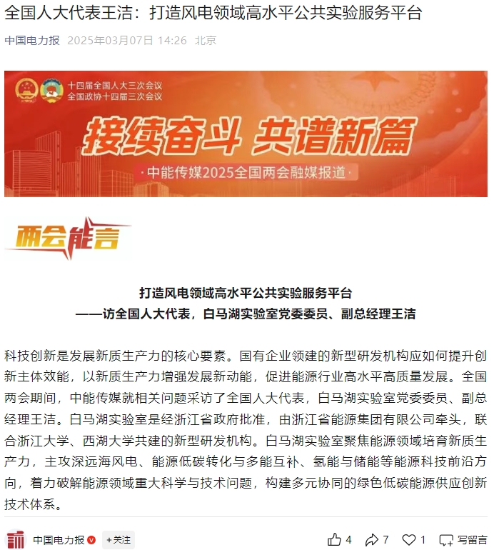 《中國電力報》微信公眾號報道《全國人大代表王潔:打造風(fēng)電領(lǐng)域高水平公共實驗服務(wù)平臺》。 中國電力報微信公眾號 圖