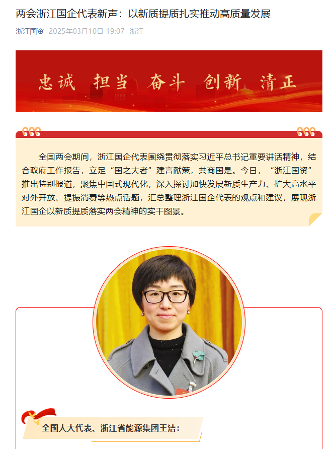 “浙江國資”微信公眾號報道《兩會浙江國企代表新聲:以新質(zhì)提質(zhì)扎實推動高質(zhì)量發(fā)展》。 浙江國資 圖