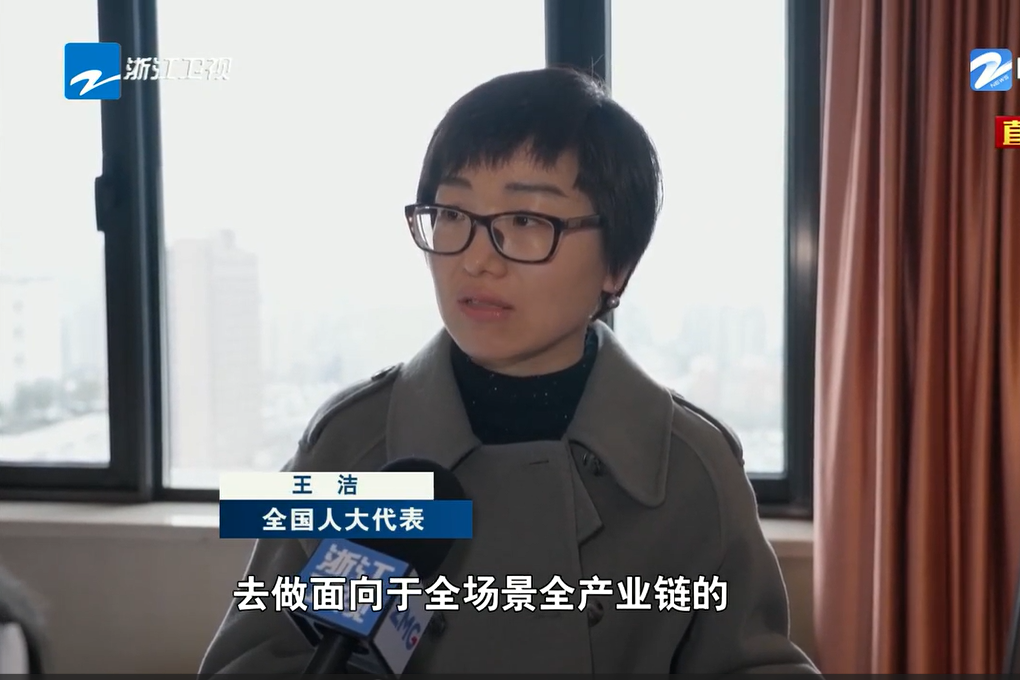 浙江衛(wèi)視《浙江新聞聯(lián)播》報道《直通全國兩會 出席十四屆全國人大三次會議的浙江代表團抵京》,采訪王潔同志。 浙江衛(wèi)視《浙江新聞聯(lián)播》 圖