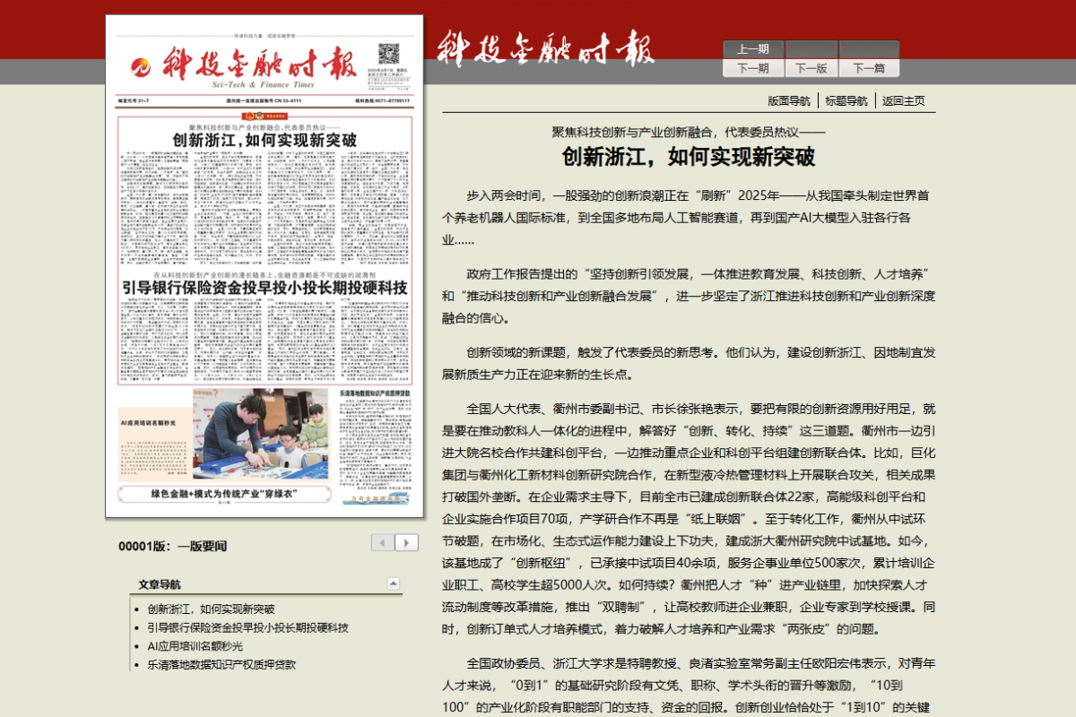 《科技金融時報》報道《聚焦科技創(chuàng)新與產(chǎn)業(yè)創(chuàng)新融合,代表委員熱議——創(chuàng)新浙江,如何實現(xiàn)新突破》。 科技金融時報 圖