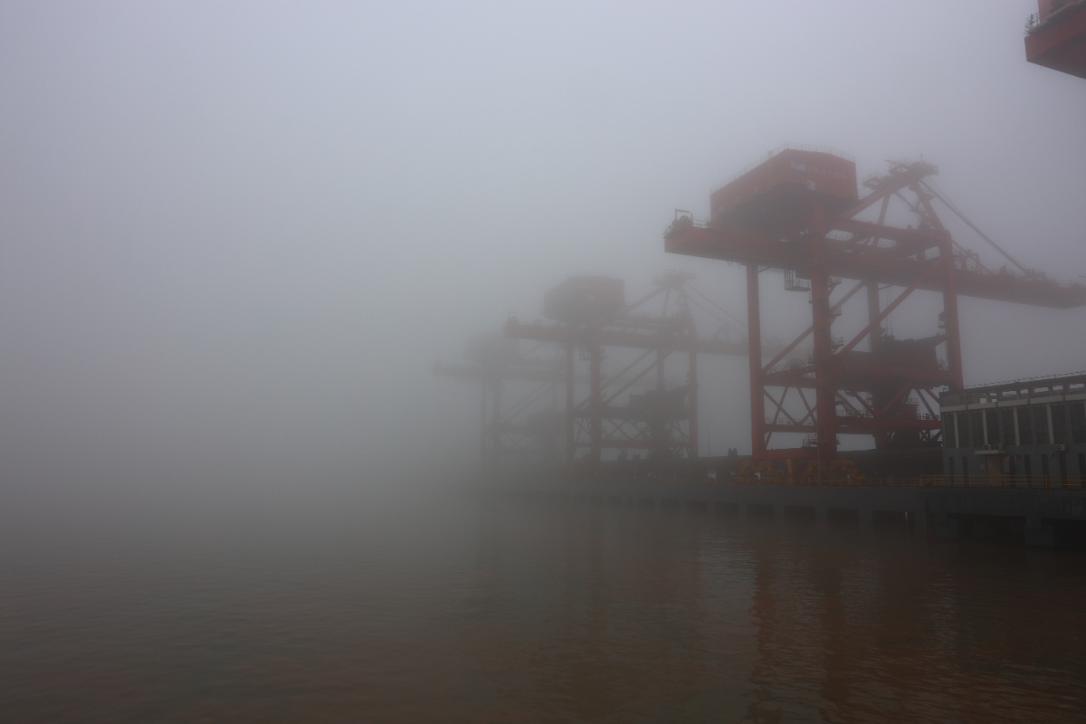 浙能港口港區(qū)大霧彌漫,如同一塊巨大的幕布。 錢(qián)威 攝