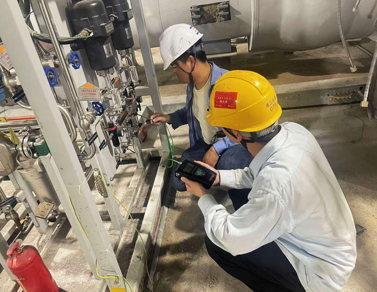 發(fā)電機(jī)氫氣系統(tǒng)查漏小隊成員拿著氫氣檢漏儀仔細(xì)排查各可疑漏點(diǎn)設(shè)備。 龔嘉沫 提供