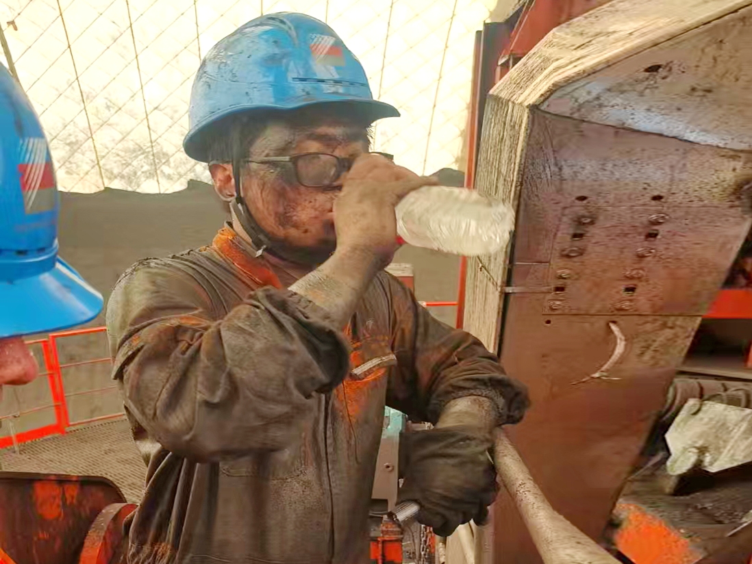 滿(mǎn)身煤泥的檢修人員正在檢修間隙補(bǔ)充水分。 潘黎明 攝
