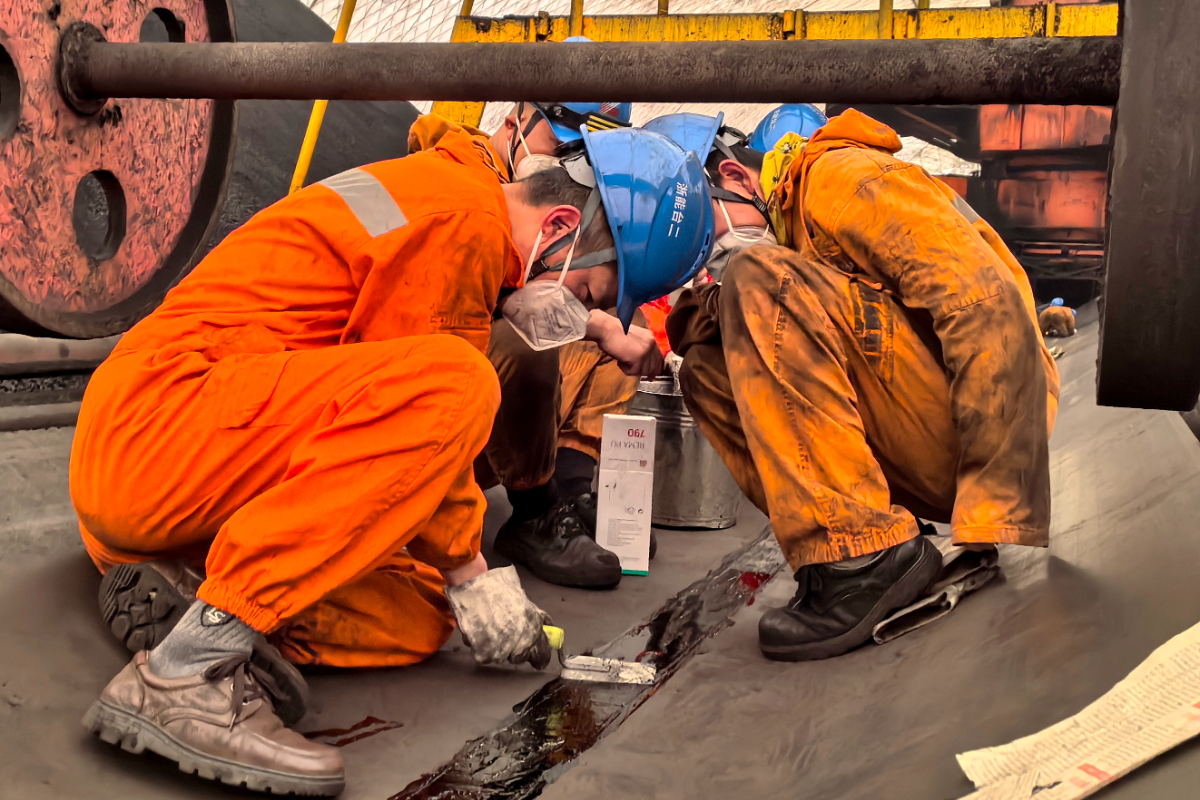 浙能臺(tái)二電檢修人員正修補(bǔ)皮帶。 羅邦吉 攝