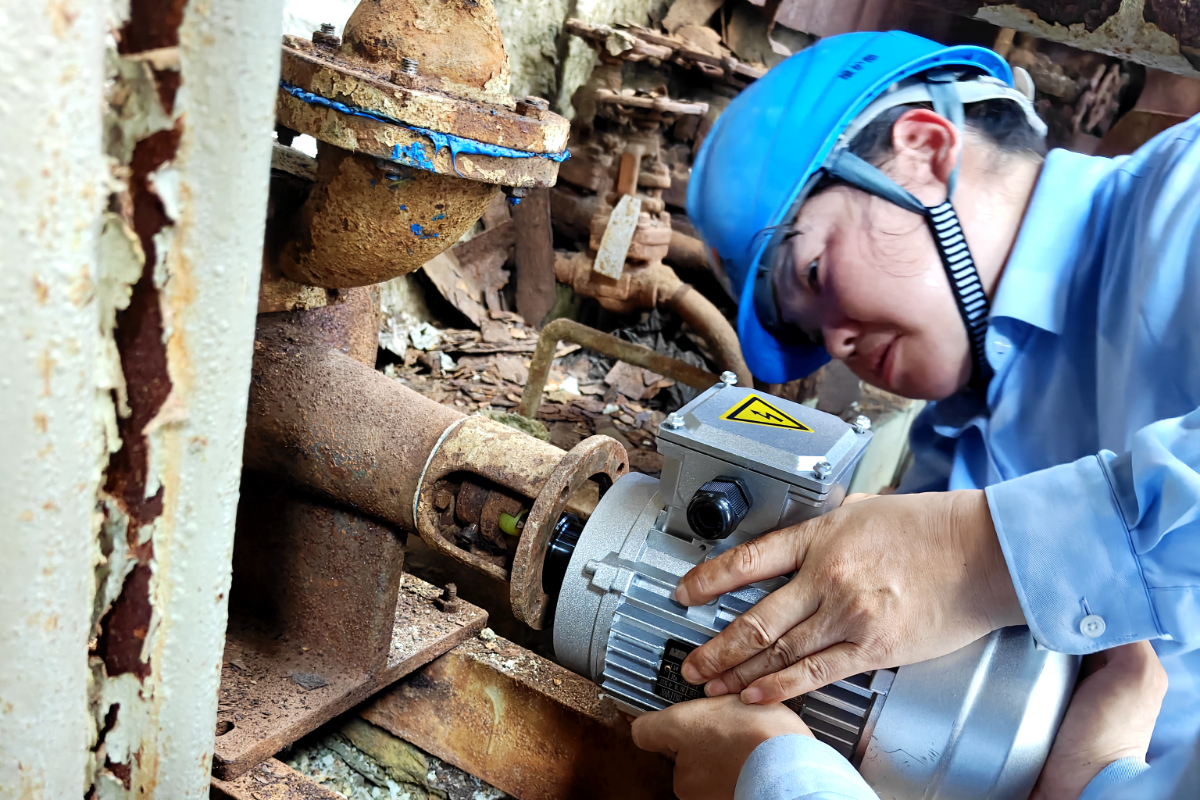 話音未落,金潔接到班長電話,要趕到9號爐MGGH登高更換超聲波吹灰器電機。接近二十斤重的電機看似不重,但需要在狹小空間內托舉接近半小時,十分考驗力量與耐力。而同班組的王海嬌則趕往廢水預處理更換1號提升泵電機,她頂著烈日耐心地整理著電纜與接口,與同事們一起奮戰一上午完成了電機更換工作,等工作完畢已是汗濕全身。