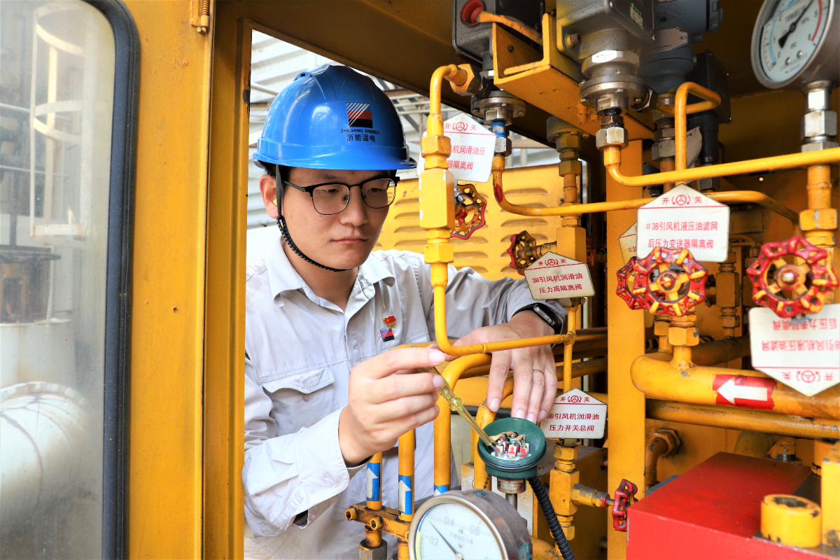 浙能溫電黨員黃永杰在精細檢查設備運行狀況。 李永輝 攝
