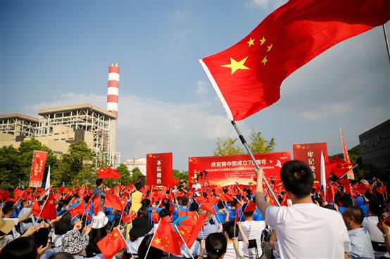 華發電公司青年樂隊以一曲《我愛你中國》唱響浙能人的奮斗情、愛國心。此次文藝志愿活動以“獻禮祖國”為主題,浙江省文聯組織國內有影響力的各藝術門類的40多名藝術家,頂著烈日,獻上了歌曲、舞蹈、小品、雜技、魔術等精彩節目,展現了70年來國家和民族所發生的巨大變化,弘揚愛國主義精神,謳歌人民幸福生活。演出現場氣氛熱烈,博得現場陣陣掌聲,職工們揮舞國旗、齊聲歡唱,不時拿起手機記錄和分享一個個精彩的演出瞬間。