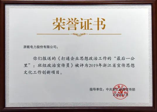 近日,從中共浙江省委宣傳部傳來好消息,浙能集團報送的浙能電力《打通企業思想政治工作的“最后一公里”:班組政治宣傳員》被評為2019年浙江省宣傳思想文化工作創新項目,浙能集團是兩家獲獎的省直單位之一,也是唯一獲獎的國有企業。