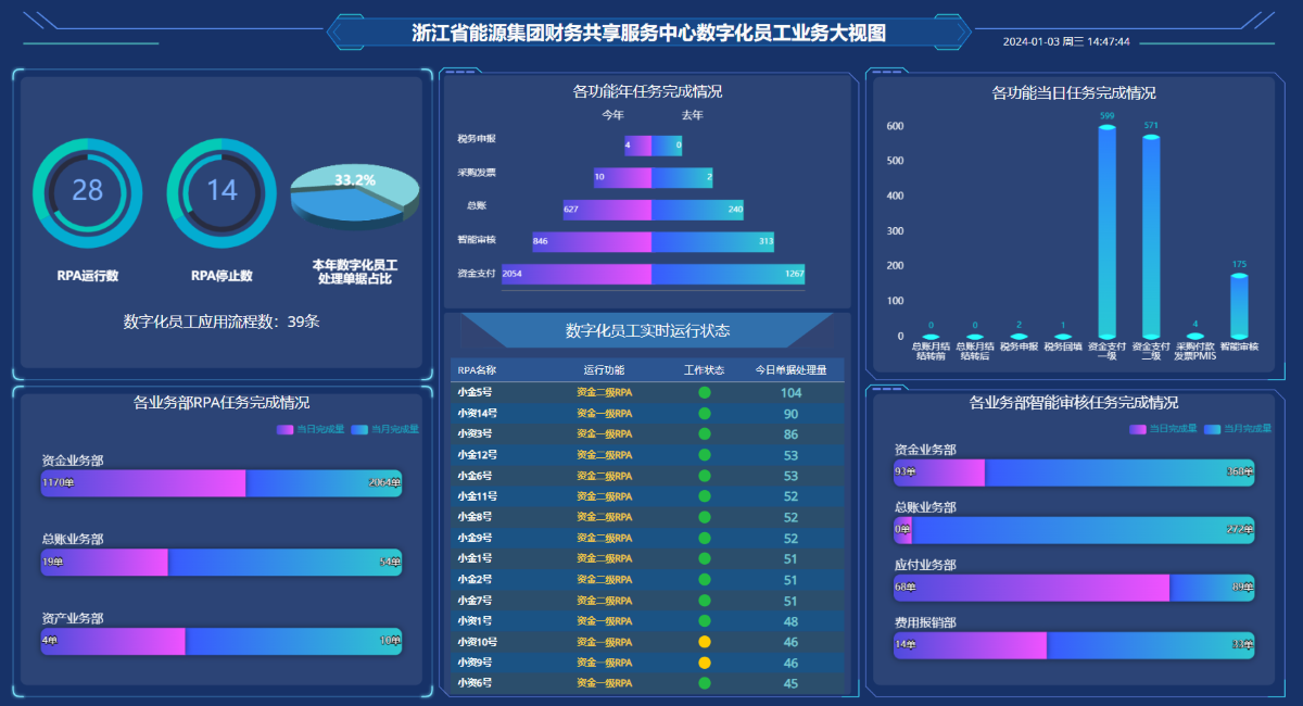 浙能財務共享運營平臺上線以來已推廣21批線上運行427家單位,開發(fā)129支標準化流程,與SAP等20個業(yè)財系統(tǒng)實現(xiàn)集成,覆蓋用戶3萬余人,從無到有打造以智能化、流程和數(shù)據(jù)驅(qū)動、業(yè)財稅資檔一體貫通、財務風險控制和財務人才培養(yǎng)為主,富有浙能特色、不斷迭代升級、賦能價值創(chuàng)造的財務共享金名片,走在浙江國資國企前列。在數(shù)智化方面,該平臺采用統(tǒng)一架構的端到端數(shù)字化平臺,利用IPA智能流程自動化、OCR智能審核、AI、NLP自然語言處理、全場景遠程辦公等先進技術手段,搭建起流程、審核、運營和數(shù)治四個方面組成的智能應用體系,實現(xiàn)憑證和支付自動化率雙雙超過99%,其中數(shù)字員工、數(shù)字化監(jiān)督看板、智能語音提單、智能派單、智能客服等一批功能應用頗具特色、業(yè)內(nèi)領先,榮獲上國會“2022年智能財務最佳實踐年度綜合大獎”。