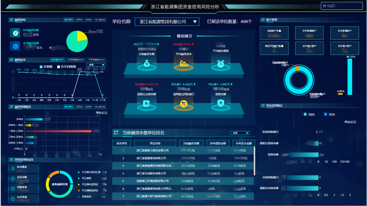 資金信用風險管理系統(tǒng)分兩部分,一是部署于省國資委財務風險監(jiān)測平臺下的資金信用風險子系統(tǒng),應用于省國資委及各省屬企業(yè),旨在加強國資國企資金信用風險監(jiān)測;二是部署于浙能集團的資金管理系統(tǒng),旨在提升資金管理精細化、集約化及智能化水平,提高資金運營效率,防范資金風險。到目前,國資委側系統(tǒng)已完成17家省屬企業(yè)集團推廣,企業(yè)側系統(tǒng)已完成浙能集團約500家成員單位推廣。歷經(jīng)多次版本更迭,系統(tǒng)功能不斷完善,已實現(xiàn)賬戶全生命周期閉環(huán)管理、融資業(yè)財一體化管理、債務風險預警、資金信用輸出風險監(jiān)測、大屏智能化分析等功能,切實提升省屬國資國企資金信用風險管理水平。