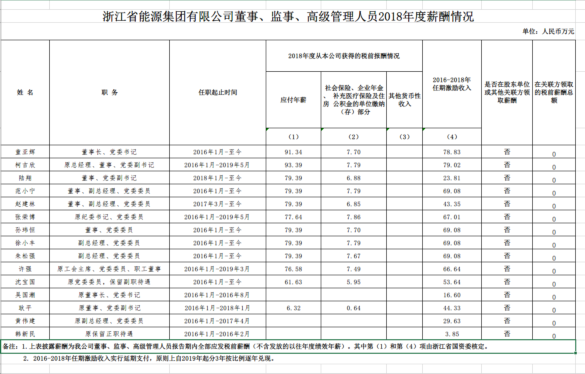 2018年度浙江省能源集團有限公司董事、監事、高級管理人員薪酬情況